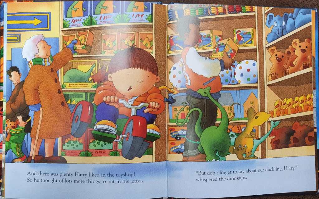Another delightful story in the Harry and the dinosaurs collection, although this one references Christmas in the title, it is more about wishes in general, than the festive period. Harry enjoys holding a duckling at his Grandma’s farm, then fixates on that being top of his Christmas wish list. Even a trip to the toy store does not distract him from his original wish, or does it?